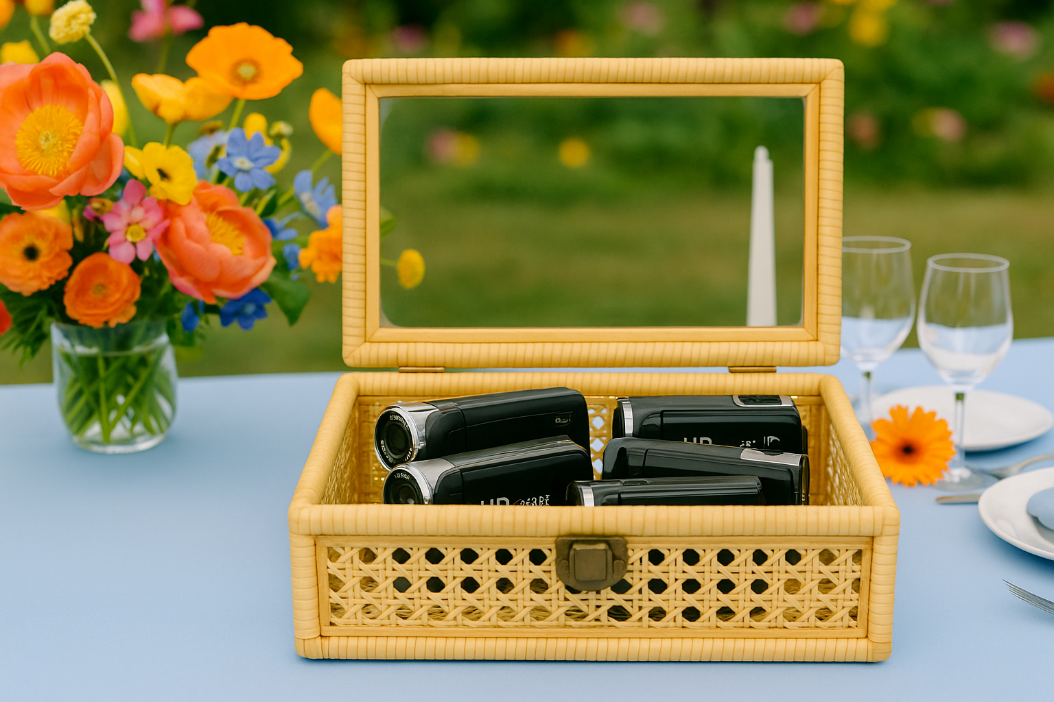 Includes 4 mixed video cameras (camcorders, Flip cameras, and digital Super 8), upload link, and 3 edited highlight films (1–2 minutes & 5–7 minutes & 10-20 minutes). Also includes a basket if you’d like to place them on your welcome/reception table.Additional Camera +$75